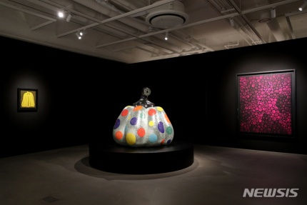 갤러리 S2A 개관 기획전 ' 쿠사마 야요이 Journey to the Unbounded Universe: 영원한 여정' 전시 개막을 앞둔 13일 서울 강남구 갤러리 S2A에서 열린 기자간담회에 현대미술의 거장 쿠사마 야요이(Yayoi Kusama)의 작품이 전시되어 있다. 갤러리 S2A는 한국미술품 최고가 작품인 김환기 (1913~1974) 대표작 '우주'(Universe 5-IV-71#200)의 소장자이자, 미술컬렉터인 김웅기 글로벌 세아 그룹 회장이 대치동 사옥에 마련한 갤러리이다.